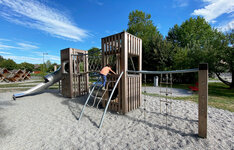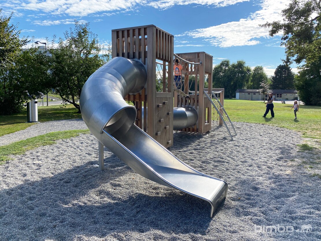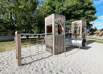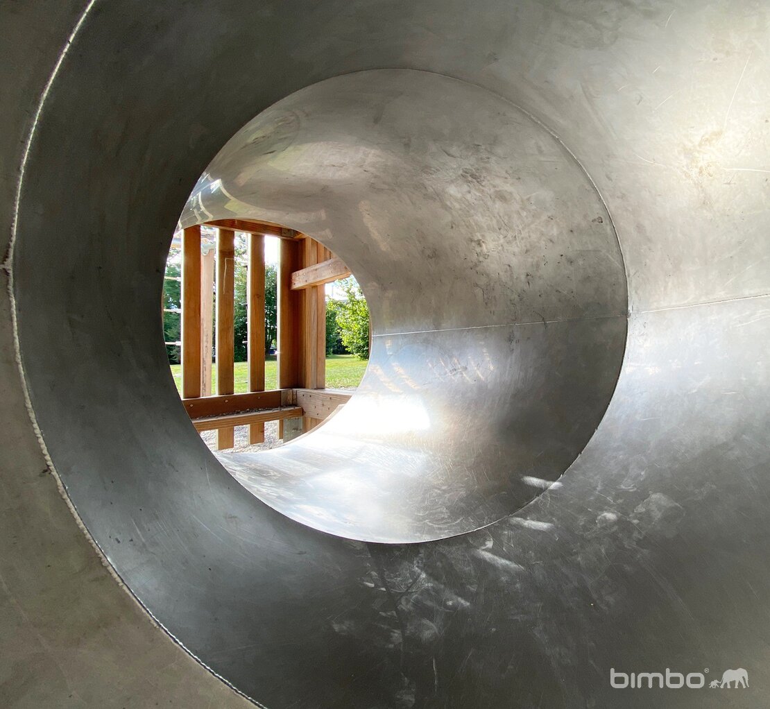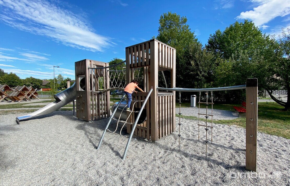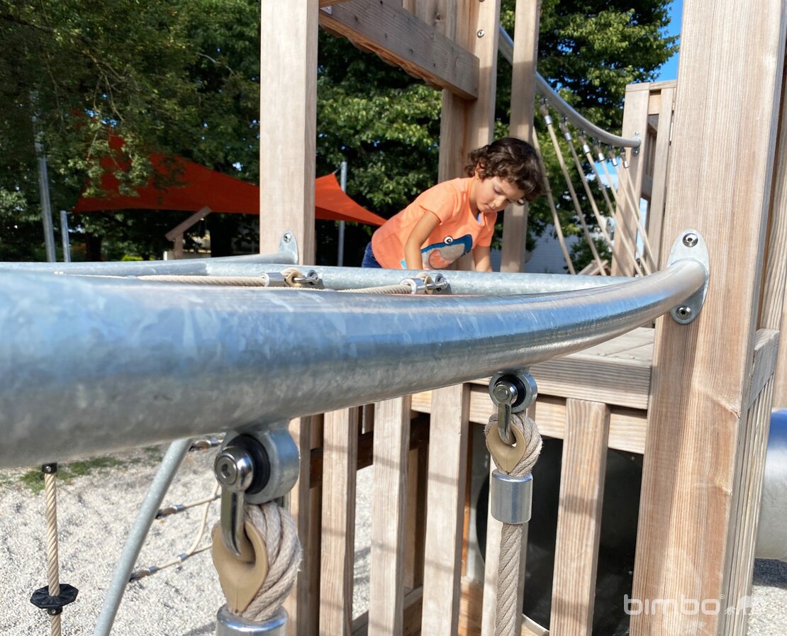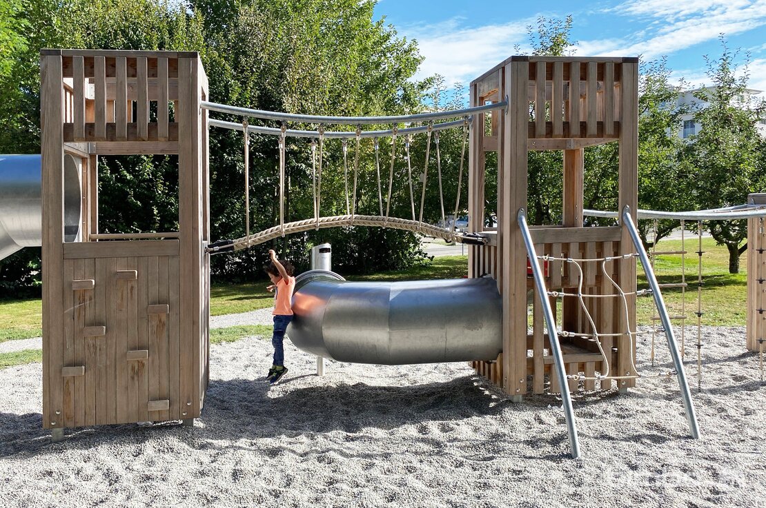 Cette installation compacte enrichit le parc proche d’une école. Les deux niveaux permettent beaucoup de valeur de jeu sur un espace réduit. Exécution en bois de douglas Suisse en combinaison avec des parties en inox et en acier galvanisé et tous les détails durables de la gamme bimbox.