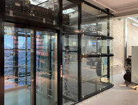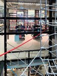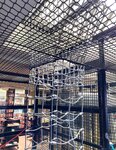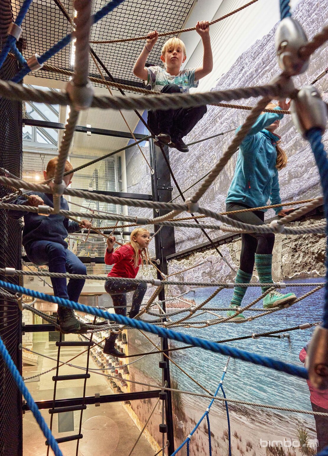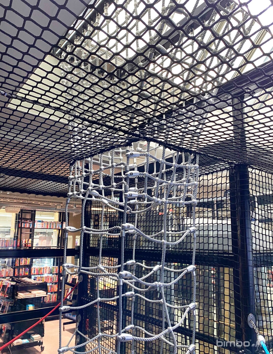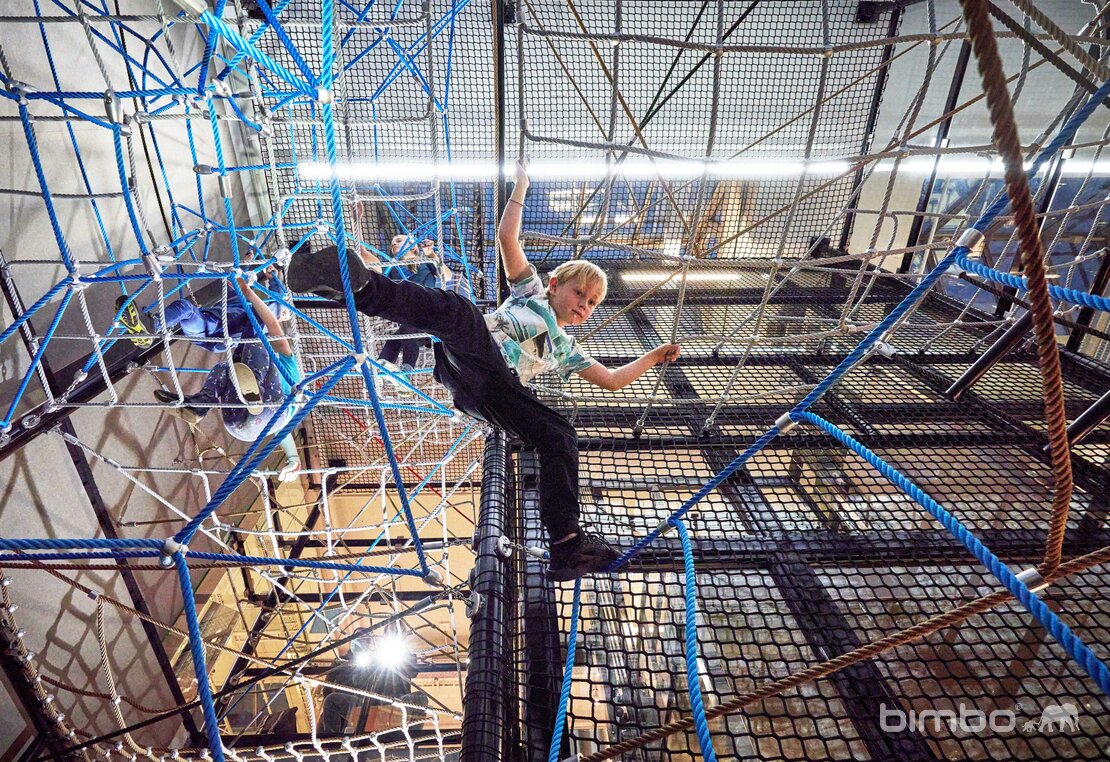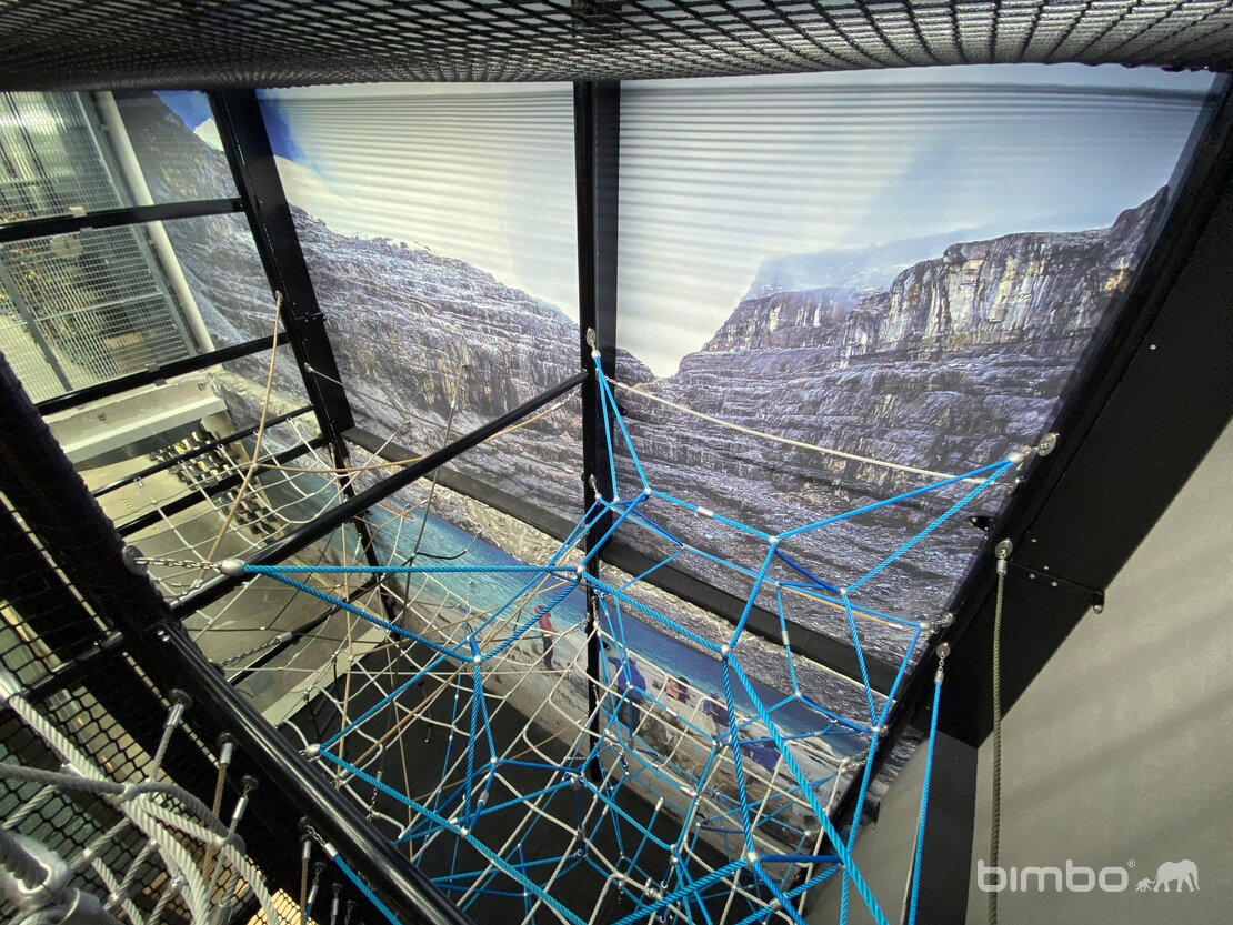 Diese vielseitige Seilnetz Kletterlandschaft befindet sich direkt in einem Verkaufsladen. Die Anlage wurde in eine Liftverglasung integriert und führt über mehrere Stockwerke. Ganz oben können die Kids über ein Dachfenster nach draussen sehen. Stahlkonstruktion mit Glasverkleidung. BSF-Stahlseile mit Aluknoten und bimbo Spezialverbindungen. Bodenbelag mit Gummi Fallschutzplatten. Viele Sonderdetails.